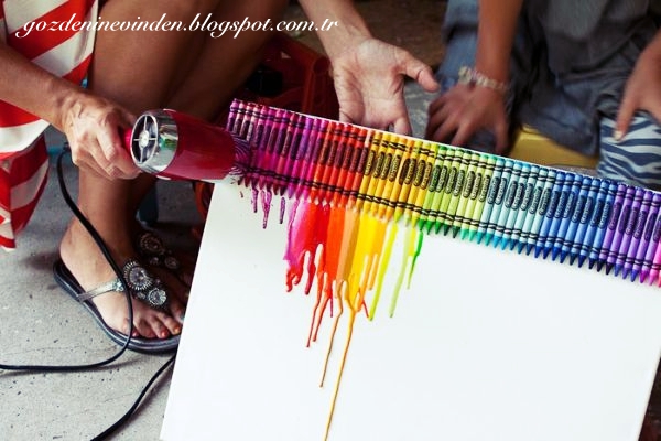 Benim size burda en önemli tavsiyem boyaların tamamını eritmemeniz olacak. Kağıt kısmına geldiğiniz de bırakın onlar kalsın. Tuval kuruduktan sonra duvarınıza asabilirsiniz. Değişik bir fikir isteyenler için önerim. Tuval tam ortasına bir beyaz kağıdı yatay şekilde sabitleyin.